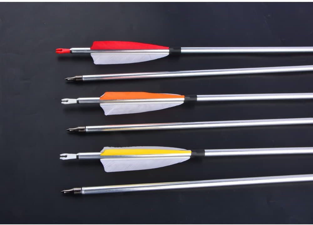 Item name: aluminum arrow Total length: 31.77in/80.7cm Standard length: 30 in/76.2cm Spine:500 OD: 7.6mm ;ID: 6.45mm; Shaft material: 7075-T6 aluminum arrow Weight: about 34g Feather: 4 inch shield turkey feather Nock:white insert nocks Tip: 100 grain arrow tips with O ring Package include: 6/12 x aluminum arrow