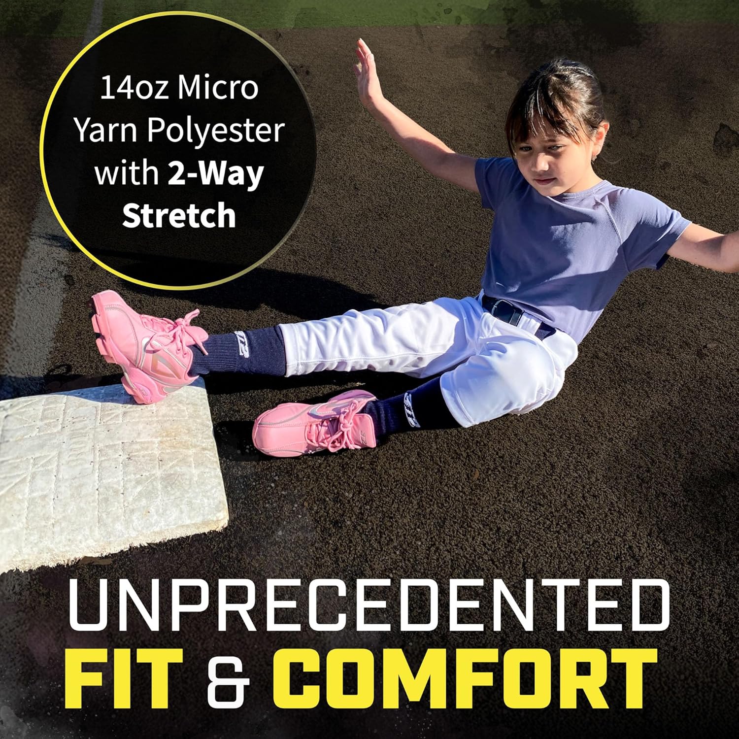 • The low-rise waist and high rise around the back allow our youth girls' softball pants to have a secure fit. This protection enables them to run the bases, make diving catches, and pitch their finest game.