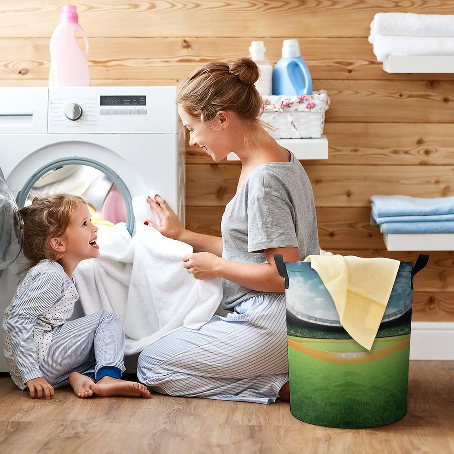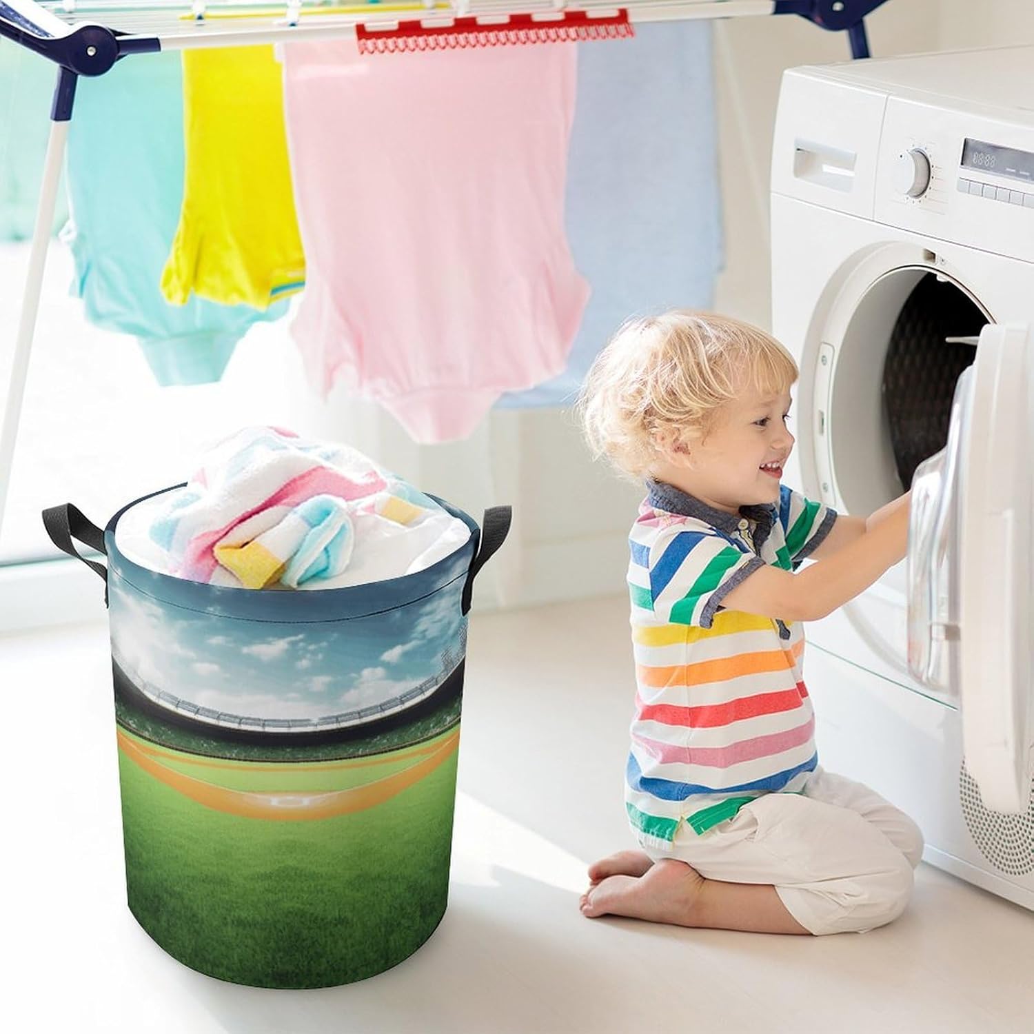 This large collapsible laundry basket is here to transform your home organization. Made from smooth Oxford cloth with a water-resistant coating, it handles damp towels and soiled clothes without absorbing moisture or retaining odors. The drawstring closure adds an extra layer of protection, keeping your items clean and dust-free whether it’s placed in your walk-in closet or a hotel bathroom. When you’re done, it folds down to a slim profile that fits easily in a storage bin or under the bed, making it perfect for small apartments, campervans, and vacation rentals.This cute laundry hamper blends functionality with a playful, stylish design that complements any decor. Measuring 13.8 inches in diameter and 17.3 inches in height, it has plenty of room for a family’s daily laundry, while its lightweight build means you can carry it with one hand thanks to the sturdy side handles. Whether you’re tossing in workout gear after the gym, stowing away extra blankets for guests, or packing it for a weekend trip, it adapts to your needs effortlessly.For anyone who loves to explore, this travel laundry bag is a game-changer. No more mixing dirty clothes with clean ones in your suitcase—simply toss your used garments into this bag, cinch the drawstring, and keep your luggage organized. Its foldable design means it takes up virtually no space when empty, so you can tuck it into a backpack or carry-on without adding bulk.Whether you’re staying in a hotel, camping in a campervan, or settling into a vacation rental, this bag keeps your belongings neat and tidy, making every trip stress-free.