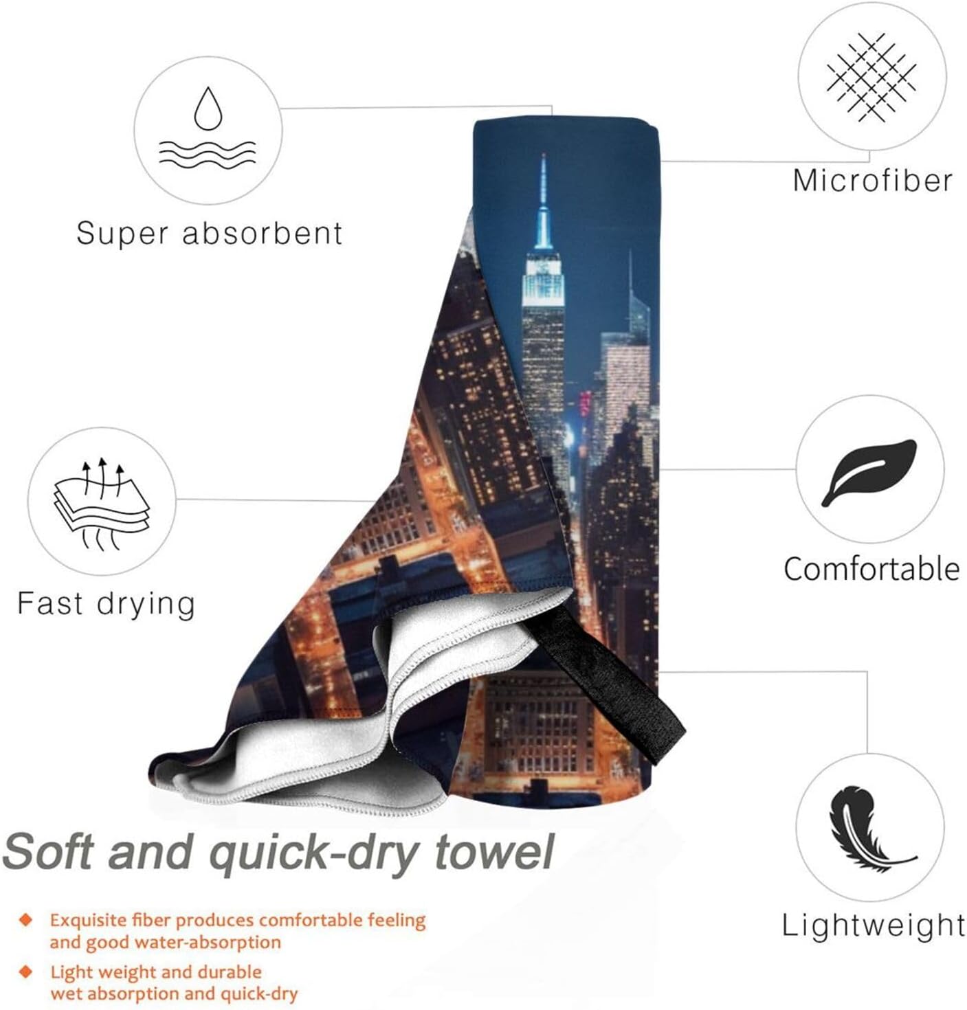 designNew York City Night compact towel for camping are designed with one-sided printing. The towels are equipped with special packaging bags and carabiners, which are convenient for packaging and hanging, and can be hung anywhere to dry quicklymaterialcompact towels for swimming is made of microfiber, which is more absorbent than standard towels, dries quickly, is lightweight, and small enough to easily fit the towel into a gym bag or backpackscene cotton towel for beach carabiner on the bag, can be attached or packed into your bag, the beach towel can also be used as a sports towel, travel towel, yoga towel or used as a beach, bathing, swimming pool, swimming, boating, sunbathing, mats for spa, sauna, water park, climbing, fitness, yoga, travel, camping, hiking, picnic, travel, outdoor and sports, etccomponentbeach blanket for swimming have buckle webbing, easy to hang and air dry, pvc packaging bag, equipped with a carabiner, easy to store and carrywashinglightweight towel for swimming machine washable, wash before first use, just hand wash or machine wash, air dry