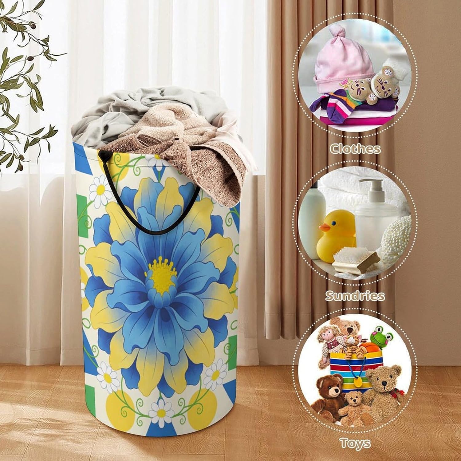 The pattern of the Sunny Flowers in Clusters hamper is printed with exquisite patterns, which makes the product more attractive.Chic design allows it to be used in the living room to hold throw blanket, pillows, and reading materials, as well as in the bathroom for towels, or as a laundry hamper.The laundry hamper adopted collapsible design, equipped with handles. It is lightweight and portable for using, storing, and moving conveniently.Sunny Flowers in Clusters Clothes hamper is suitable to store dirty clothes washing, place in the room to store toys, and other household goods, keep the house clean and tidy. Perfect laundry hamper for home, office, closet organizer, bedroom, bathroom, college dorm, etc.Gets out of your way when you need it to. This storage basket or laundry hamper is a good gift, which not only meets everyday storage needs but also carries deep care and love, a perfect way to turn thoughtfulness into warmth.